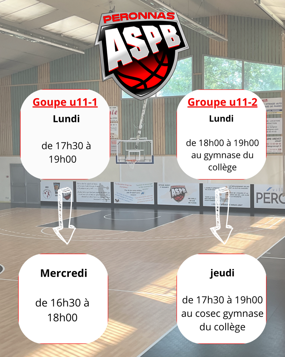 Les entrainements sont le lundi de 18h00 à 19h00 au cosec gymnase du collège et le jeudi de 17h30 à 19h00 au gymnase du collège