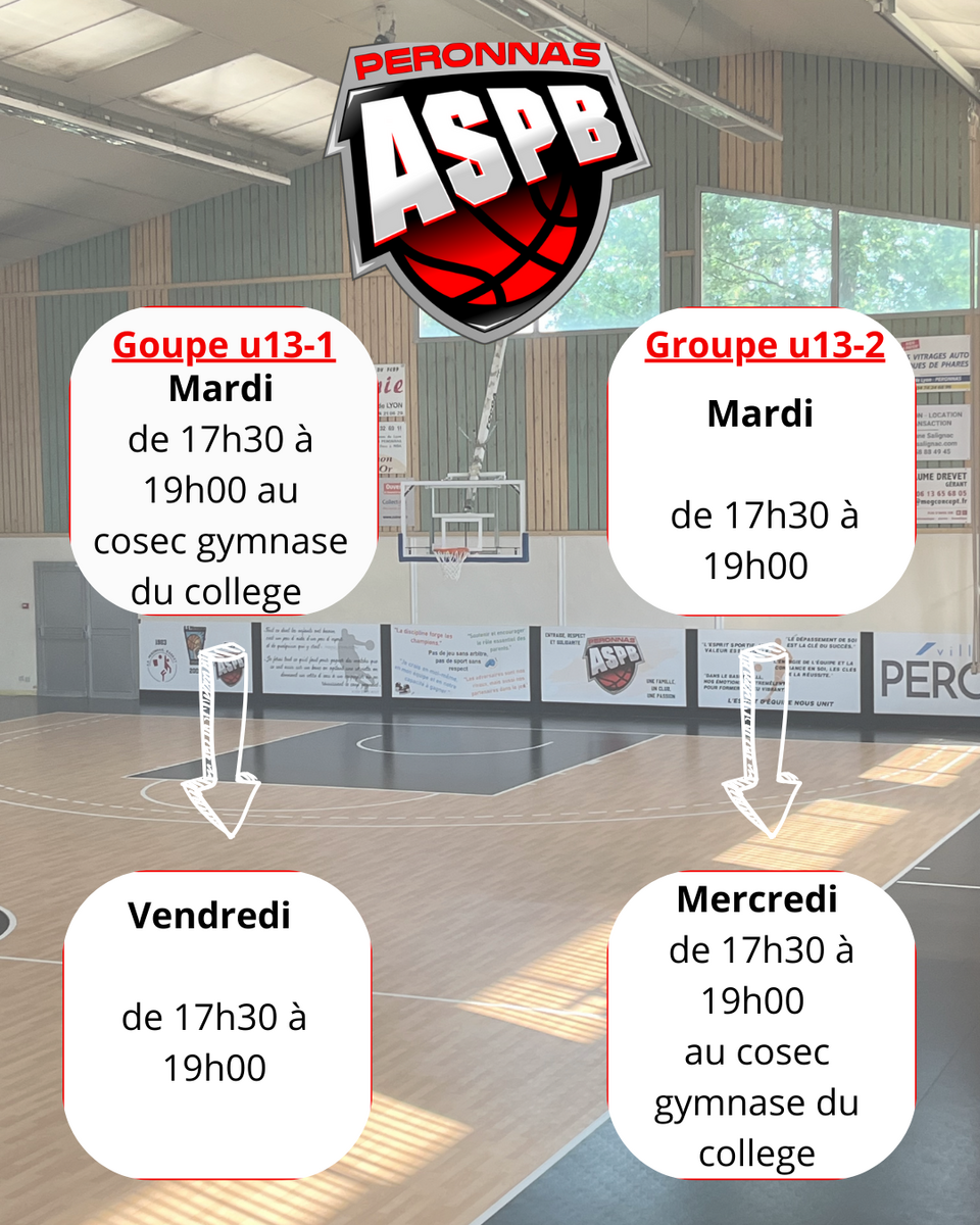 Les entrainements sont le mardi de 17h30-19h00 au cosec gymnase du collège et le vendredi à Coubertin de 17h30-19h00